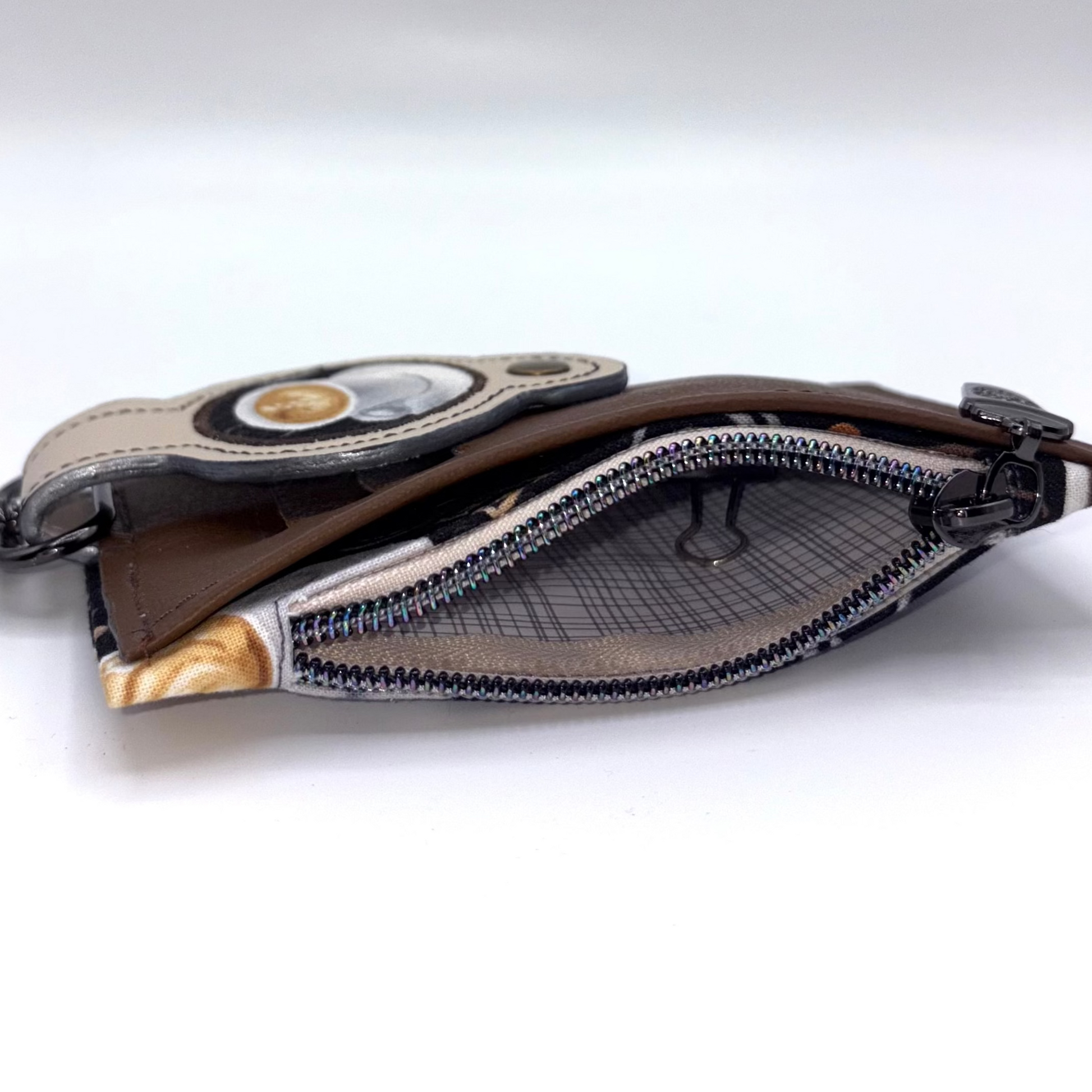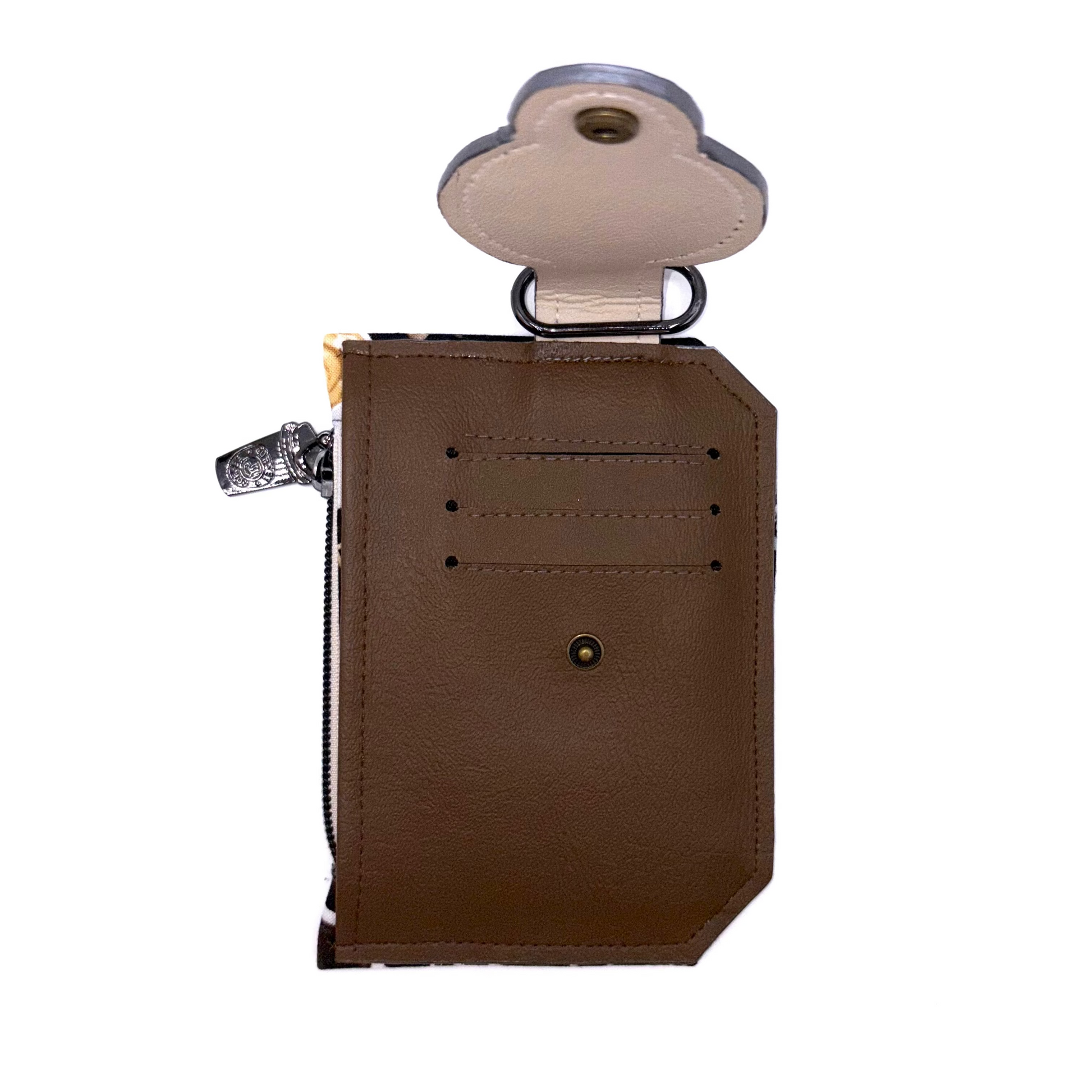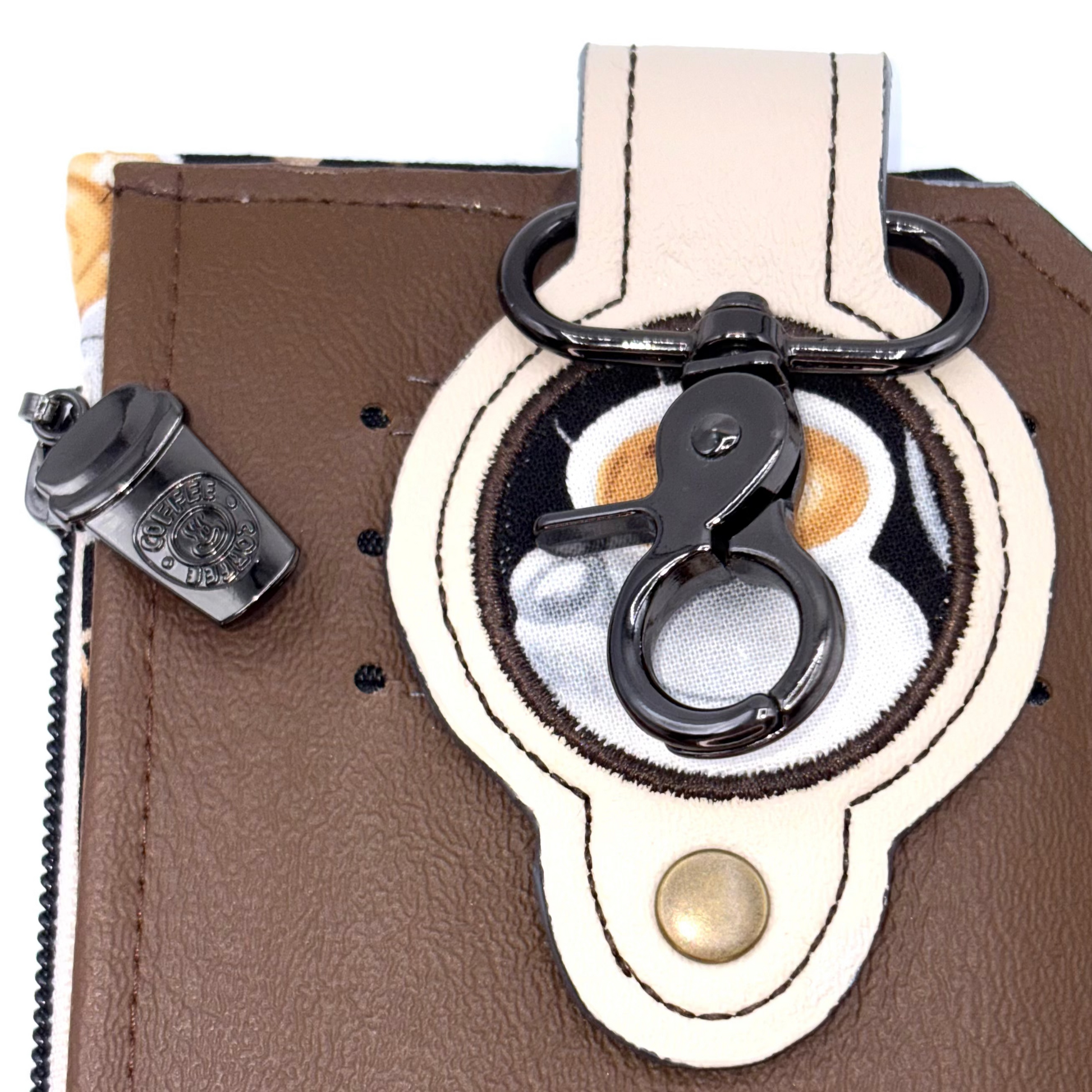 Handmade keychain wallet approximately 5" x 3" in size with brown faux leather exterior and coffee themed details