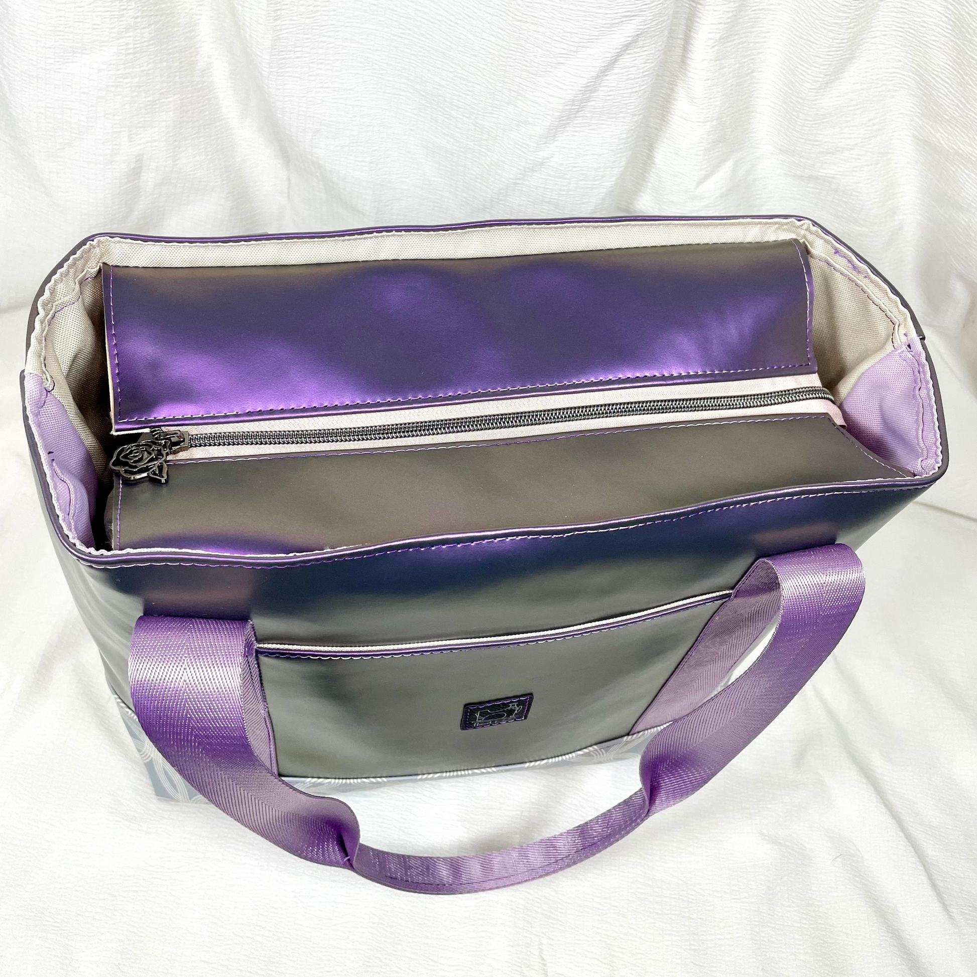 Handmade tote bag approximately 16" x 14" in size with metallic purple vinyl exterior and geometric cotton base.